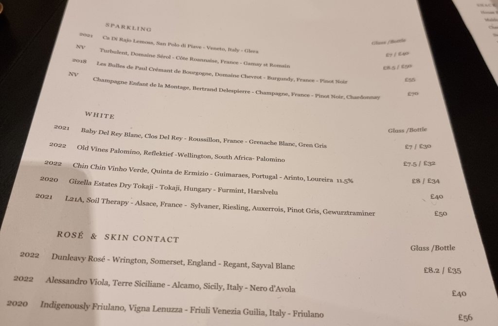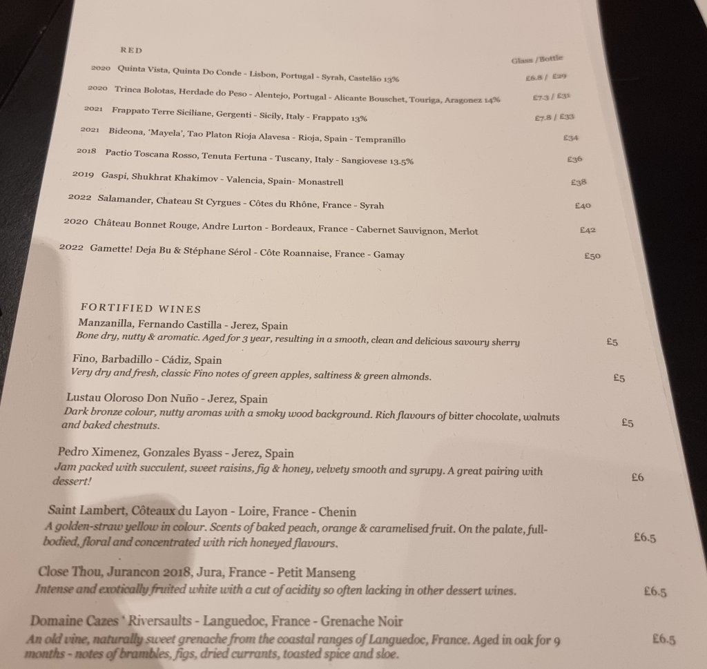 All sherry pours, including the fino and manzanilla were in measly 75ml pours, a heinous wine crime (on the eve of Sherry Week too) in my view (should be a 100ml pour as a min.). The sherry sin was compounded by the pricing, with a 75cl bottle of the Barbadillo fino retailing at a smidgen under a tenner and a 75 ml pour here a £5, so a mark up of over 5 times. Oddly the Lustau Oloroso is on the list at the same £5 for a 75 ml pour when it retails at over £22 for a 75cl bottle 🤷.
