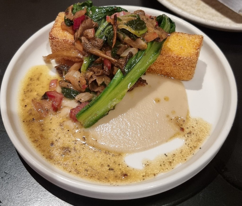 Polenta featured again with a block of the stuff deep fried, covered in a melange of various chards and mushrooms.