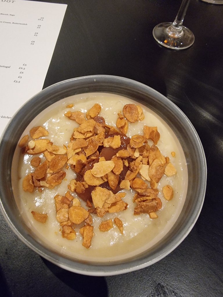 With the puds I noticed the suggested pairing with the rice pudding was an amontillado, which I thought odd (with the saying goes “If it flys – amontillado” and I can’t say I have ever seen a rice pudding fly), as it is more suitable to pair with savoury stuff in my humble opinion. Thinking it wouldn’t really go I asked for a glass of the oloroso (probably should have gone PX), hoping the sweet aroma but dry taste of an oloroso would be more suited to the quince and spice in the rice pudding.