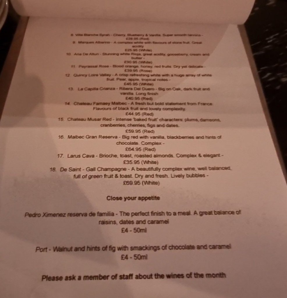 For the second night, I had spied a Chateau Musar 2017 (a glorious Lebanese wine which I have always been a big fan of and of which I have a fair few bottles in the wine room at home) on the list for (to me) the very reasonable price of £59.95 (it retails at £36 + – more often than not over £40, so a more than fair mark up, with me having seen the similarly retail priced 2016 on a list at £75.50 earlier this year).