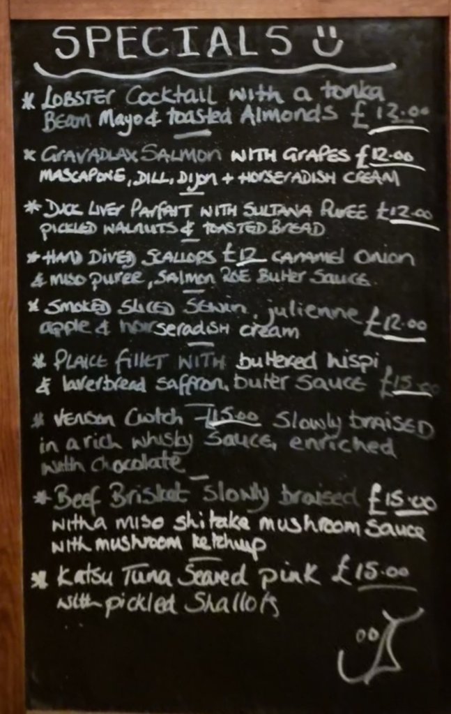 It is split into sea, land (meat) and garden (veg), as well as a specials board