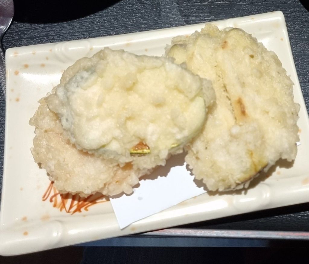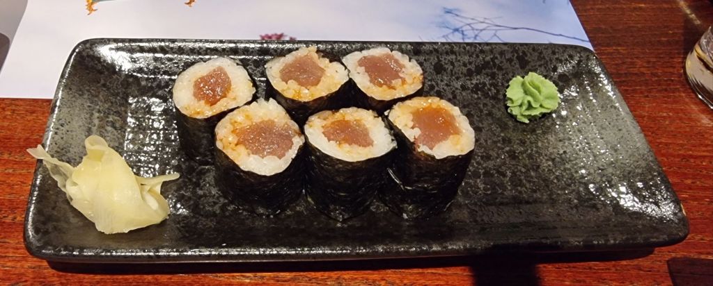 We started off with an extra. J wanted sushi, whilst I was tempted by the Takoyaki (an Osakan, as in the city, speciality). J, unfortunately, was having none of the latter positively recoiling in horror at the thought of octopus balls (with so many legs there must be a rich bounty of balls 🤣). So spicy tuna rolls it was.