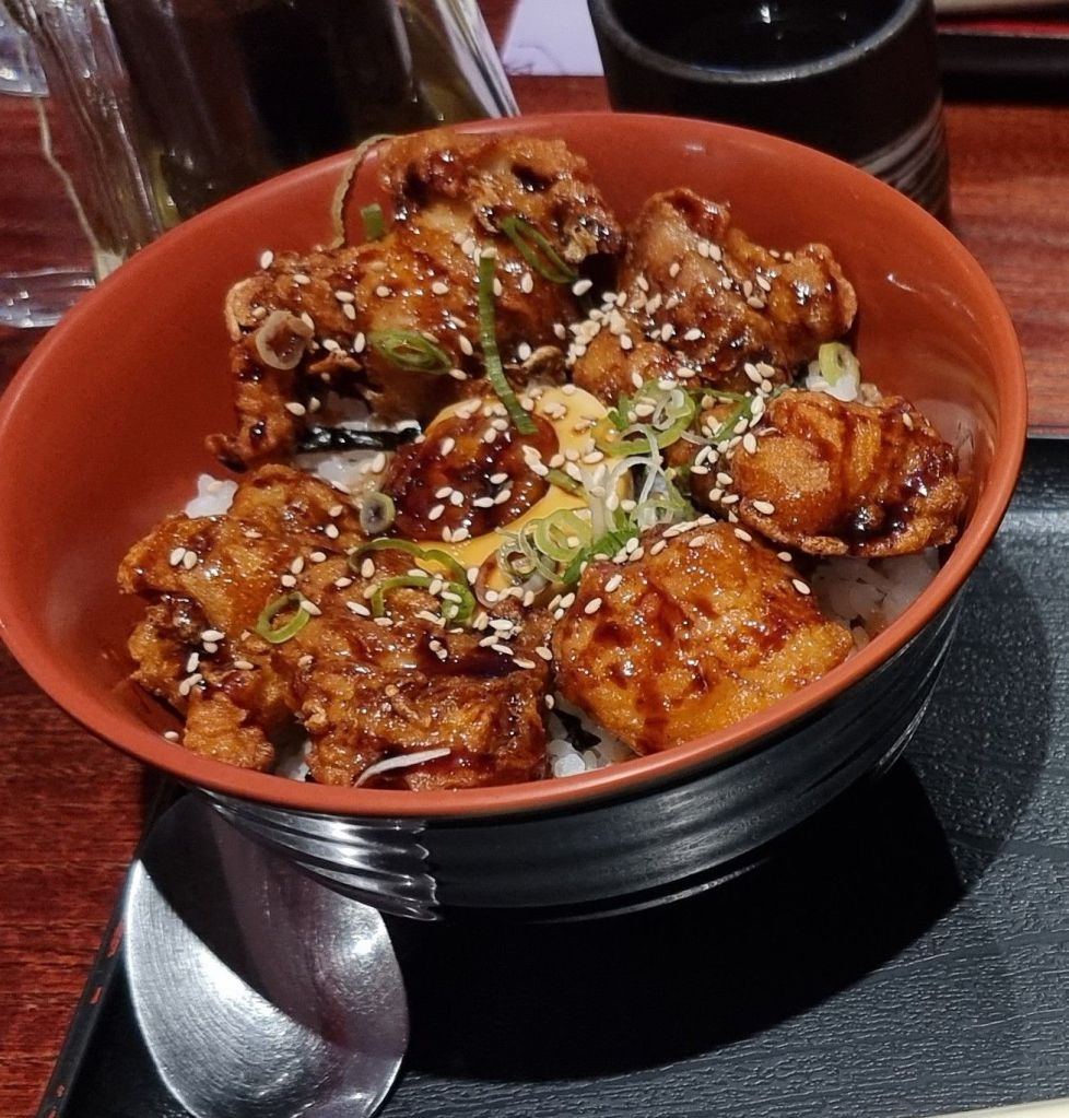 A good, crisp (light), coating was liberally drizzled with a pleasing sweet and salty, tangy, teriyaki sauce. A good quantity of well cooked (and seasoned) rice and a soy marinated egg (good level of sticky rather than too runny goo to the yolk) make for a pleasing dish. Not high culinary art, but tasty and filling. Could have done with some pickled veg on top, I thought, in addition to the light sprinkling of spring onion.