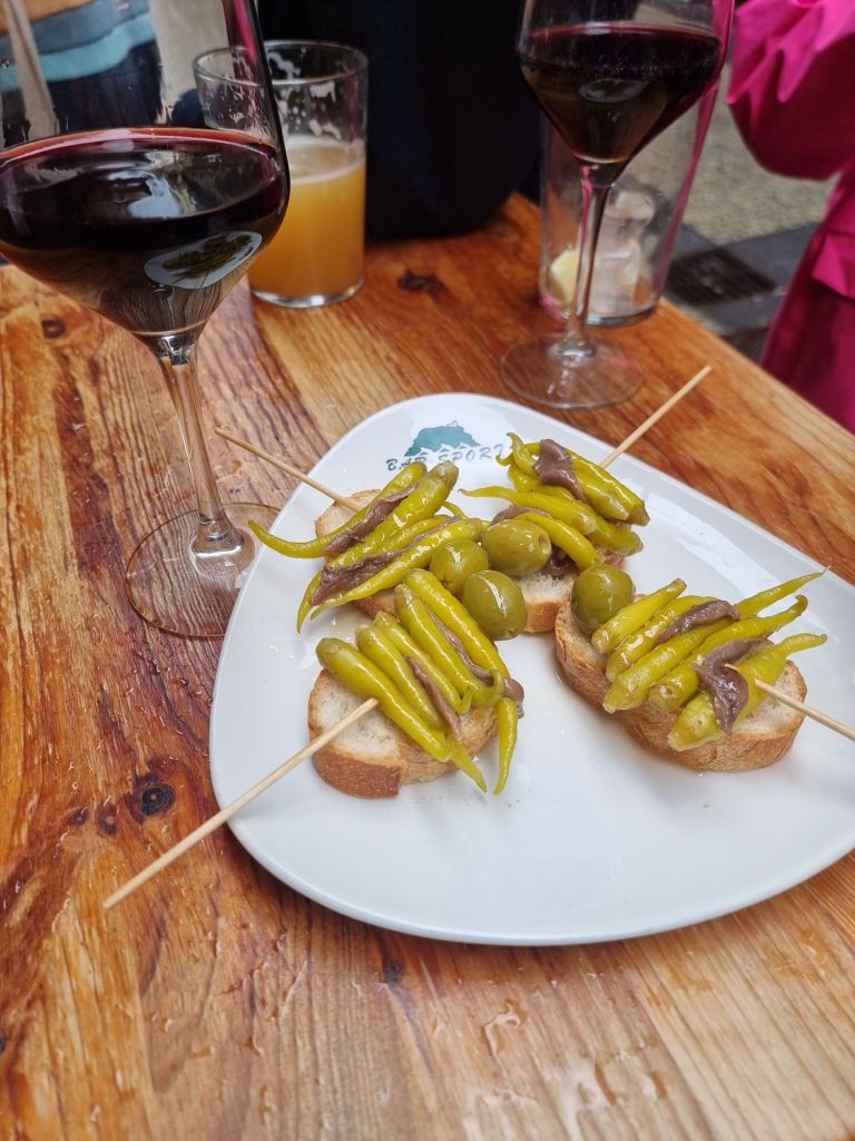 The pinxtos that allegedly started it all off in Donostia-San Sebastian was the Gilda (named in homage to film with Rita Hayworth as lead and pronounced hilda, with a hard guttural H) and with two DSS newbies with us this was our first order (think they were like a quid)