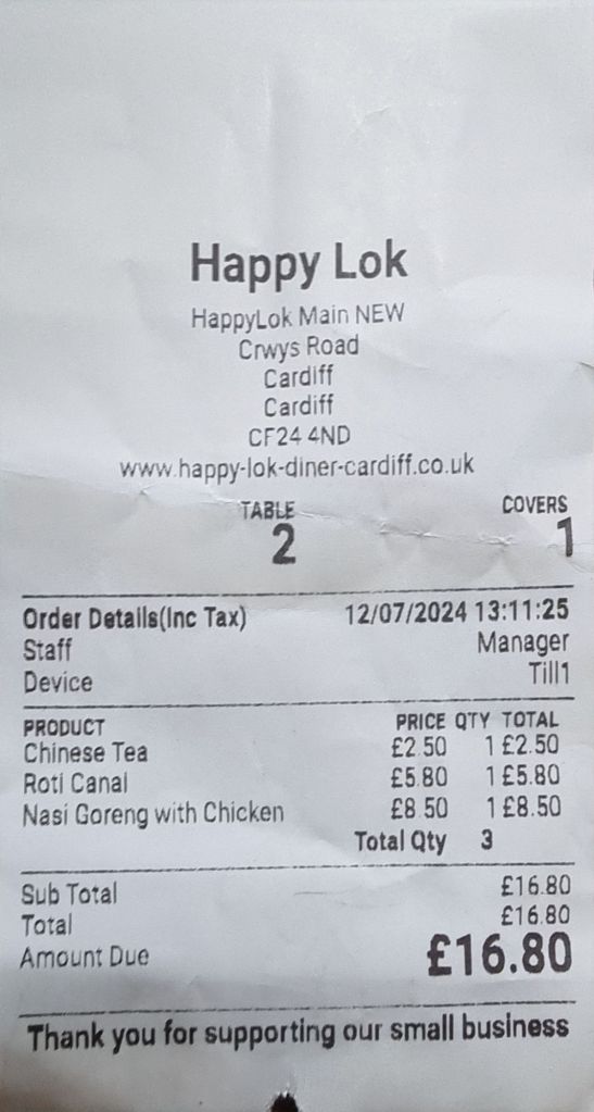 So to Happy Lok, nestled on Crwys Road, in deepest, darkest, Studentlandia aka Cathays. With Cardiff’s substantial South East Asian student population, I imagine in term time it is packed. Even with most students back home, it was fairly busy on my Friday lunchtime visit.