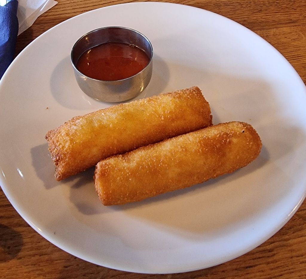 whose appearance was slightly dispoiled by having rather shattered at the top right hand corner. Oddly it was presented in a somewhat haphazard triangular form, rather than the traditional cigar roll and looked like it had been unceremoniously dropped on there from a height, as opposed to having been delicately plated.