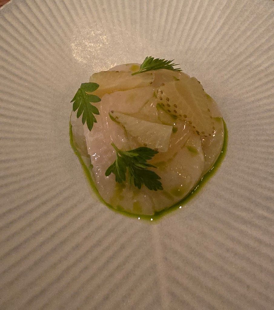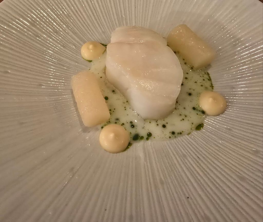 Next up was a real Bobby Dazzler of a dish, with slices of sweet scallop and pickled green strawberries.