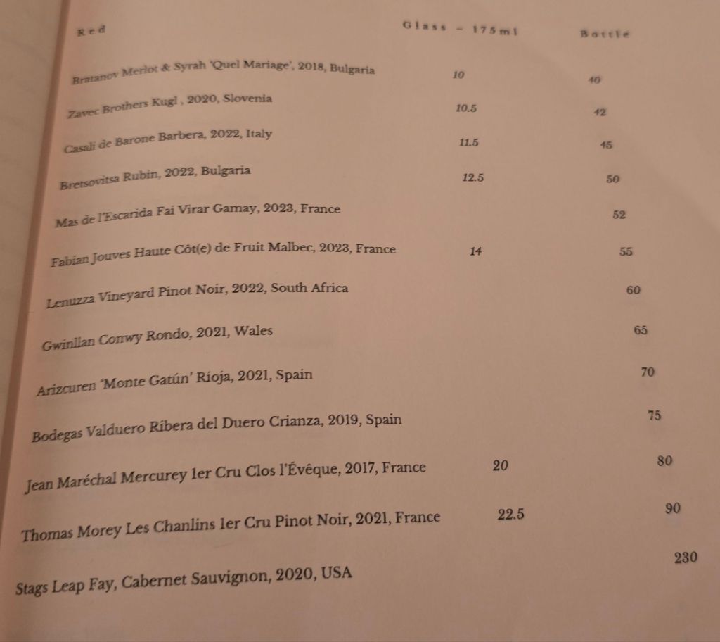 I, however, decided on just one wine (two bottles of it) to see us through to the desserts from the list (I did toy with a glass of red for the venison).