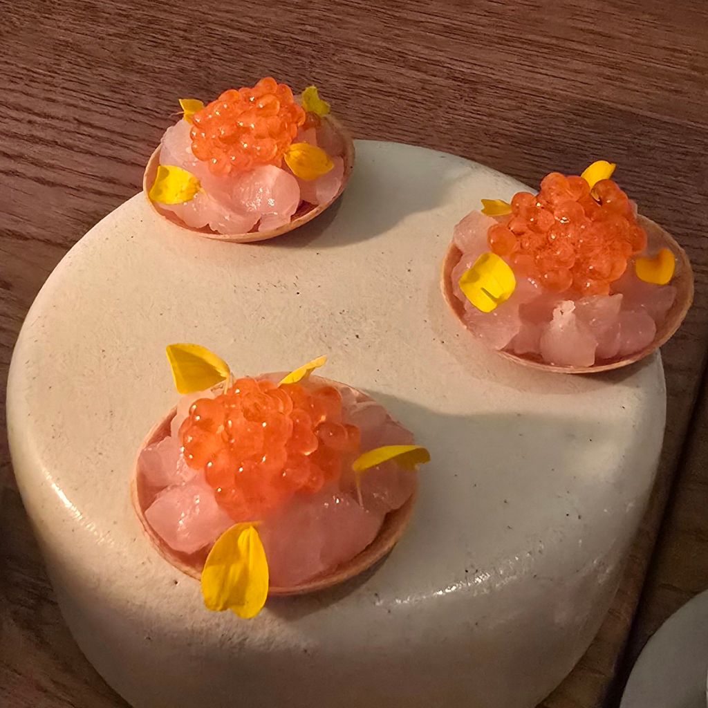 Gurnard is a a bugger to prep (being well boney, so I tend to avoid it at home and here the hard work had all been done). The raw cubed flesh had a nice firm meaty texture, with a touch of sweetness as against the acidity of a citrussy marinade/dressing. The trout roe, atopping it, popped little bombs of brininess onto the palate and the meadowsweet (not the yellow leaves – not sure what they were – nasturtium maybe) a touch of vanilla.