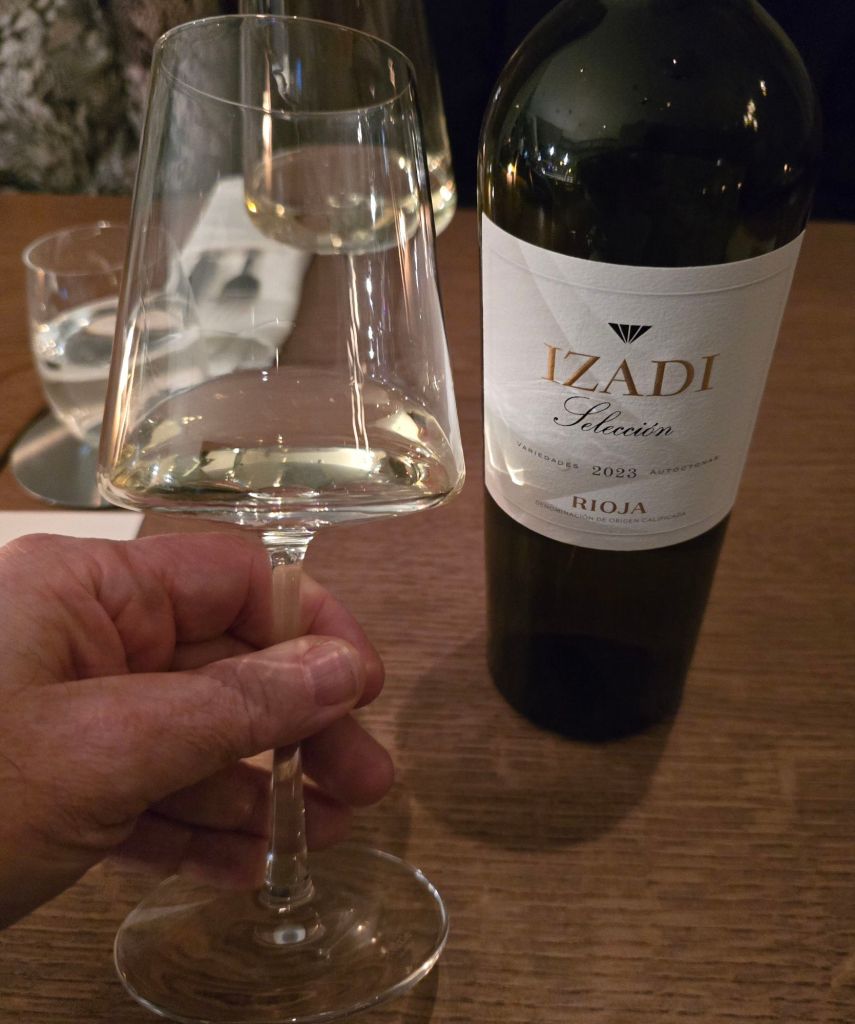 With the preponderance of non meat dishes, I decided on a white (also working on getting J away from just drinking red, so thought it a good opportunity to drive home the message) was probably the way to go and thus went for the Izadi white rioja (£48 – retails at around £18.50).