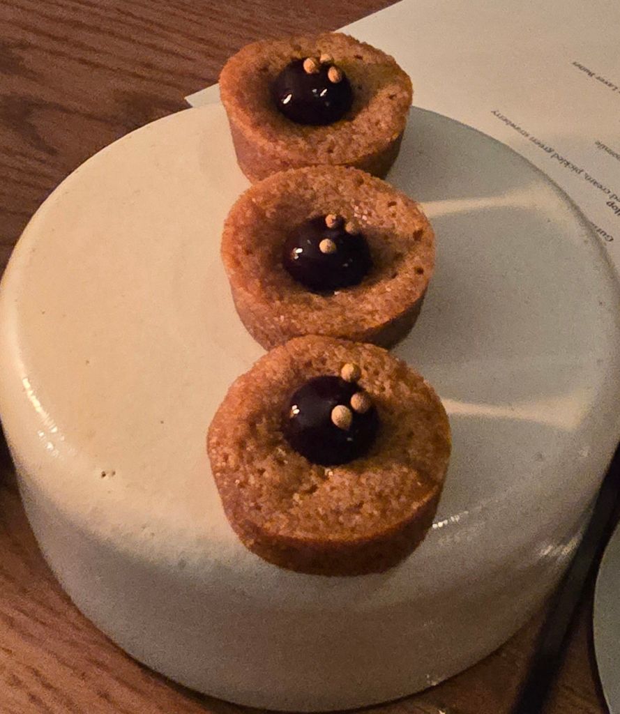 Petit fours followed, with the interesting addition of coriander seeds to some little cakey things .