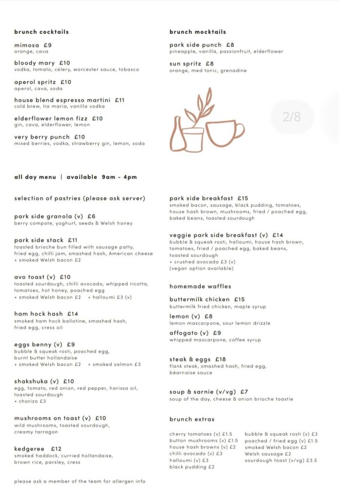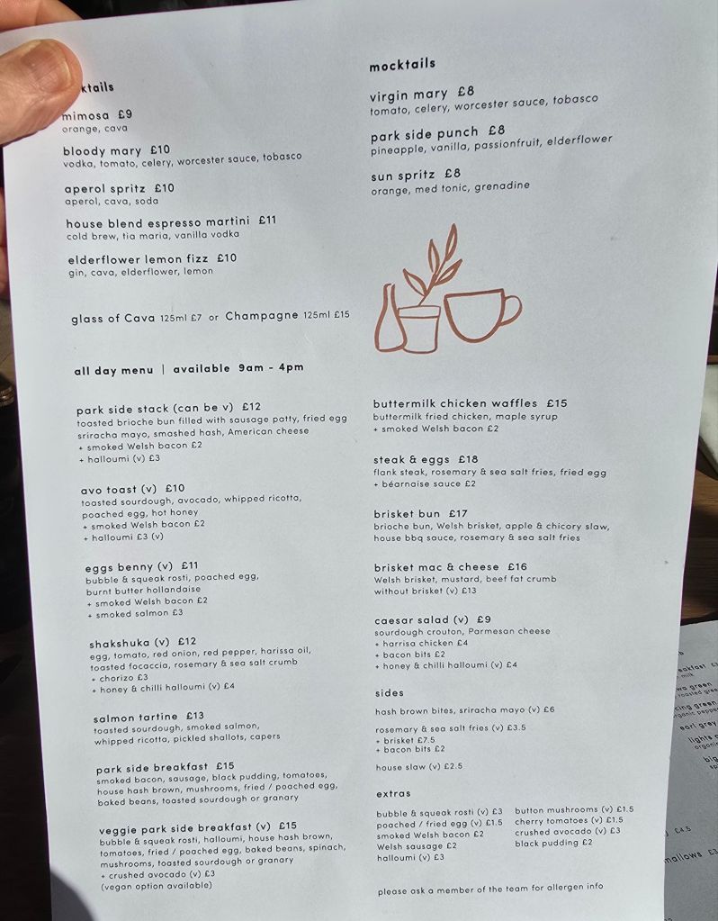 I always like to see a café menu referring to “all day” rather then the ubiquitous “brunch” and thus I was somewhat swayed by the online menu at the rather swish looking Park Side Coffee and Kitchen in the affluent Cyncoed/Lakeside burb of Cardiff.