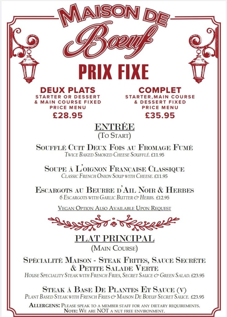 Even taking into account the “optional (my arse)” 12.5% service charge, you are talking about a smidgen over £28 for 2 courses include seafood and beef steak and under £33 for 3 courses sans drinks.