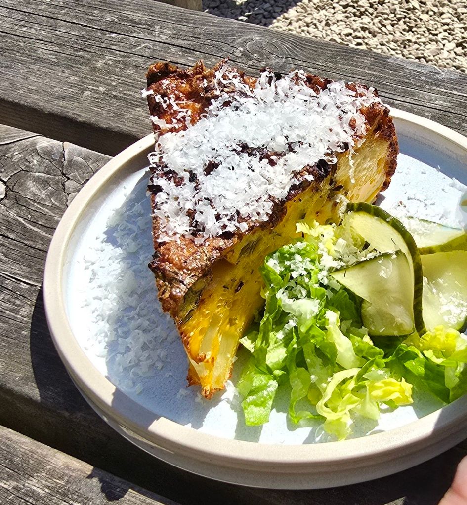 and gave way to an airy eggy interior flecked with garden veg and herbs.