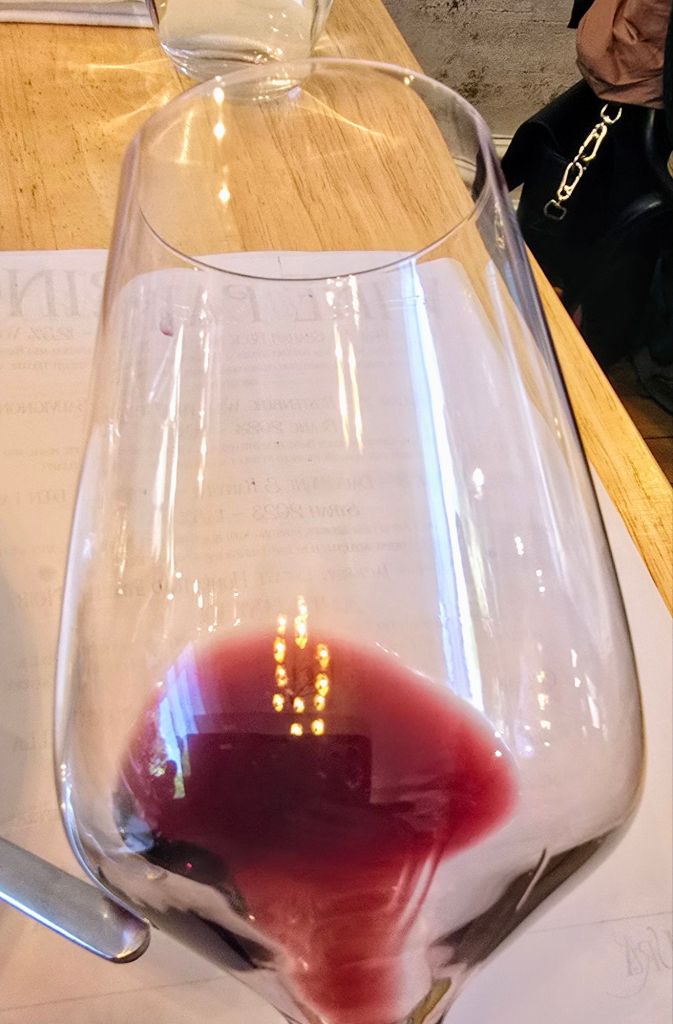 Red berry fruits (think cherry and raspberry) with a touch of spice and a nice level of acidity. Worked well as against the gelantinous fattiness of the dish.