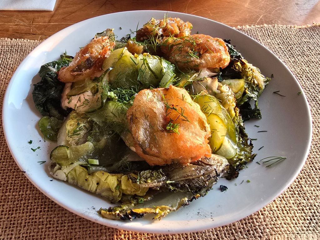 Nicely crisp, tangy, fried pickles sat on smokey (from the fire) baby gem lettuce with a sharp Russian dressing and a pleasing hit of anis from plentiful frongs of dill. My issue with this dish was the lettuce had sort of lost its structure, releasing its innate wateriness thus making it a touch limp/wet lettuce in texture. Think the overall concept is a good one, but requires a touch less cook time on the lettuce.