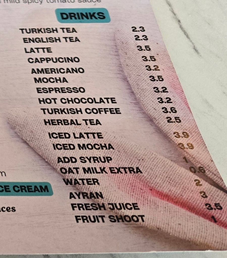 I was tempted by the ayran, which I have always quite liked (lick of salt in it makes it oddly refreshing), but fancied something hot. As a result, I opted for a Turkish tea (£2.30).