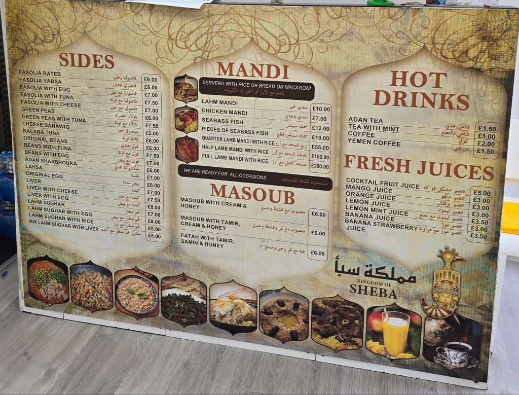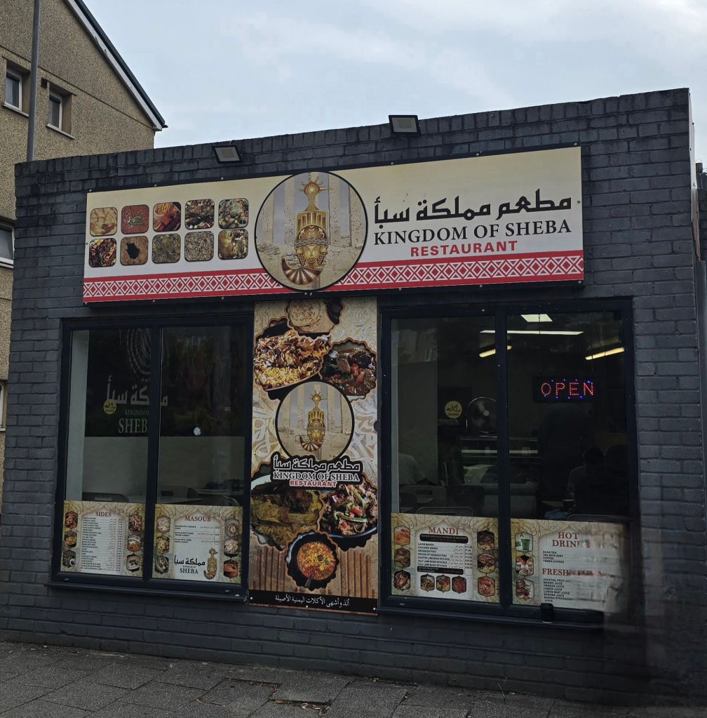Having heard from a myriad of people whose food opinions I tend to trust as to the delights of the Yemeni staple mandi, the handily placed Kingdom of Sheba hoved into view as I walked down Bute Street from Central train station, with Cardiff Bay Station seemingly out of action for the foreseeable due to the next phase of construction by Lyle Lanley Monorail, from the people who bought us the (anal) Canal Quarter.