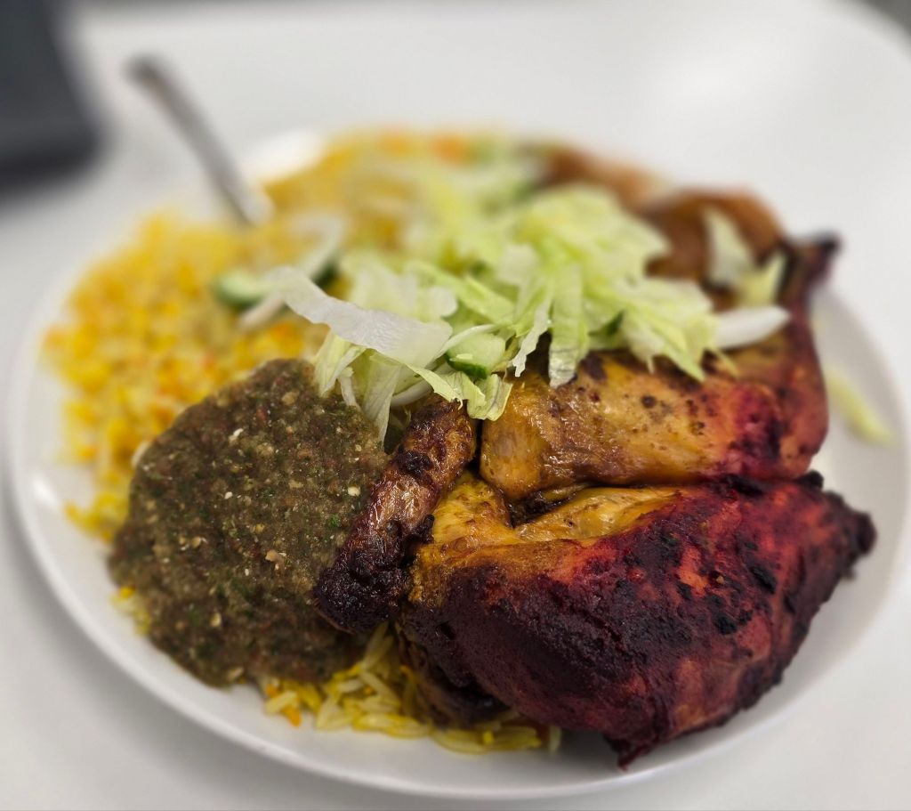 with half a chicken, a veritable mountain of rice, a salad and a potato curry. This all came in at a mere £7. Now for that price it would not be unreasonable for expectations to be on the low side. I mean I paid nigh on 20 quid retail for a chicken from Forage the other week, which I hope at that price had an in coop hot tub, daily feathercures and the pick of the choicest grubs prepared by an “Michicklin” starred chef.
