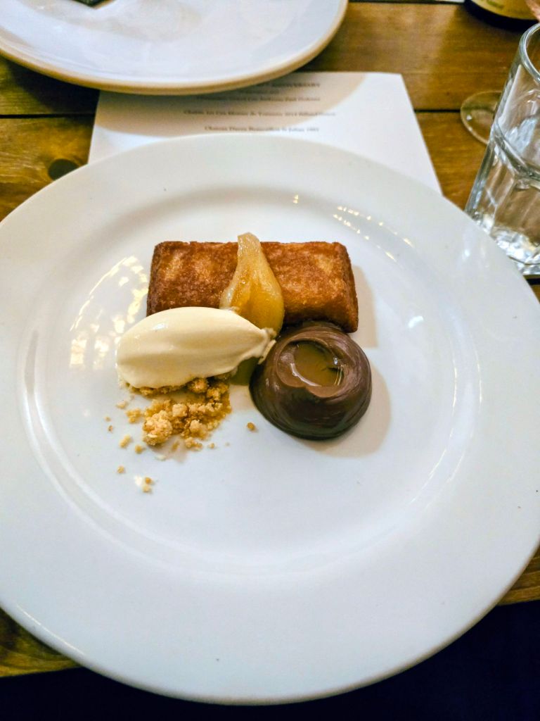 We went French, with cheese before the dessert and coming as a selection of four diverse cheeses (Dorset Blue Viney – blue, Ogleshield – hard , Tunworth – soft and Tor – goats)