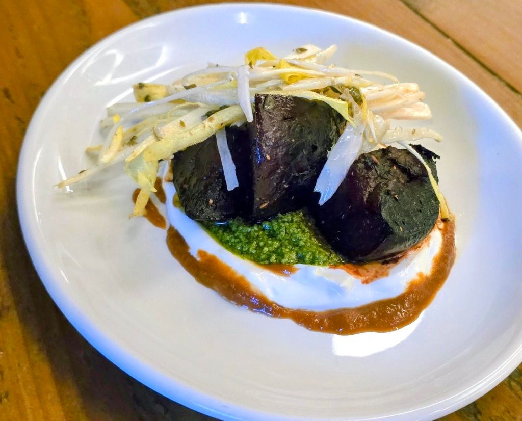 This mostly worked, with the earthy beets operating as a good counterpoint to tangy (and spicy) plum sauce and the sweet salty tang of the whipped ricotta and the light nuttiness and herbal zing of the pesto.