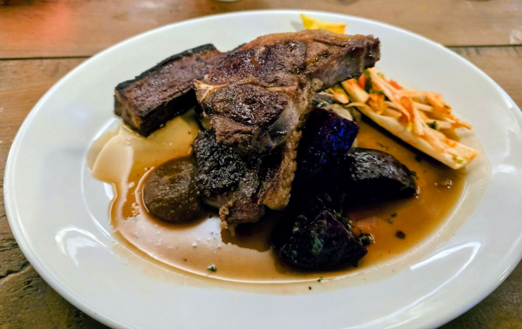 Well flavoured and cooked hulking beast of a leg steak, with the bone in, the meat itself was very well received. Less so the advertised crush new potatoes, which whilst tasting nice were a rather diminutive portion size.