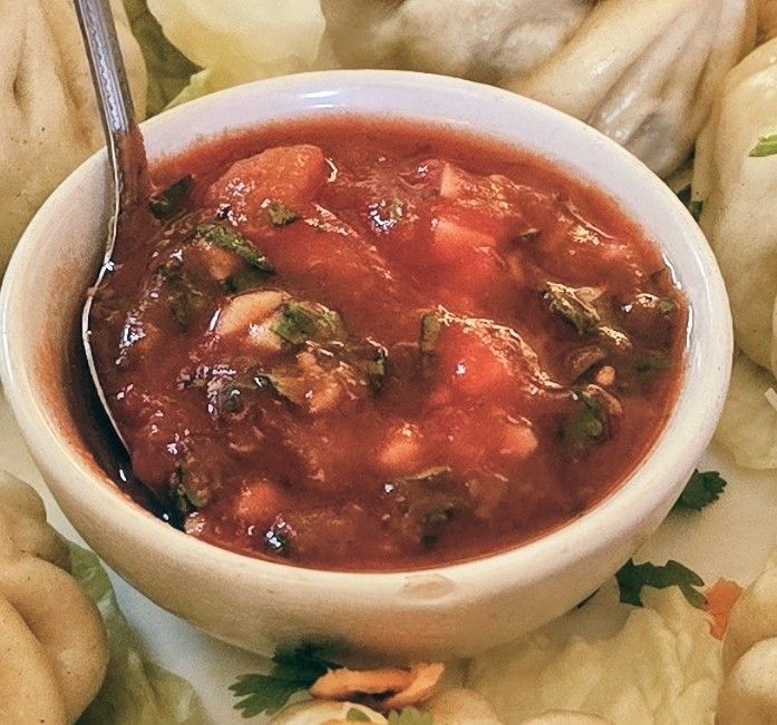 This transpired to be a mix of tomato (I was curious as to when tomato’s got to Tibet – as late as the 20th century it seems), onion, garlic and coriander with just a hint of chilli heat.