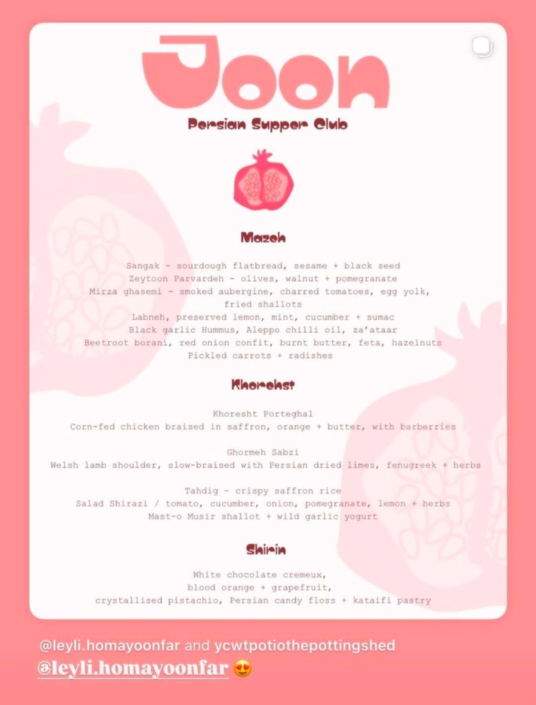 Such a thing is the Joon Persian Supper Club, by one of my favourites chefs in the form of Leyli Homayoonfar, popping up at the Potting Shed at Insole Court (which is just around the corner from my pad).