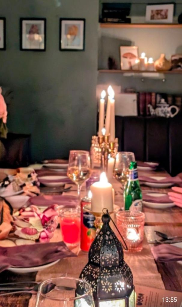 As well as this being an anathema to my introvert personality, it did cause some issues in terms of where to put the stuff (as you will see there was an awful lot of it) on the table when you took into account the cosy nature of the seating arrangement (bit of a squish) and the liberally use of candles, lanterns etc ( with my innate clumsiness I was mildly and pleasantly surprised that I didn’t set the place on fire) on the tables. All easily managed mind (especially if, unlike me, you are a sociable type), with a bit of shuffling of stuff around but things did at times seem to get lost in the melee in terms what was whose.