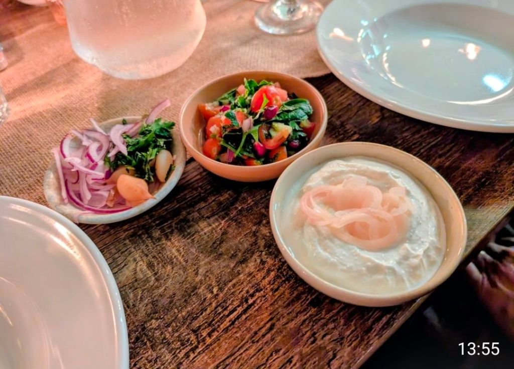 Onto the food, the first part (can’t really called it a course) was akin to a mezze type affair with a procession of little dishes and a large hunks of bread and other bits and bobs.