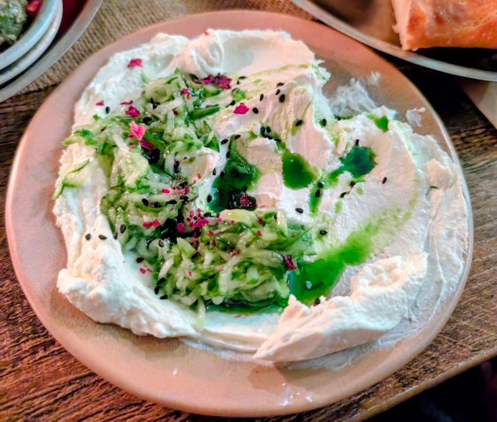 A tangy and creamy labneh was taken to another level with the salty savouriness of preserved lemons, lemony tanginess of sumac and the refreshing qualities of a rather dayglo herb oil and shredded cucumber.