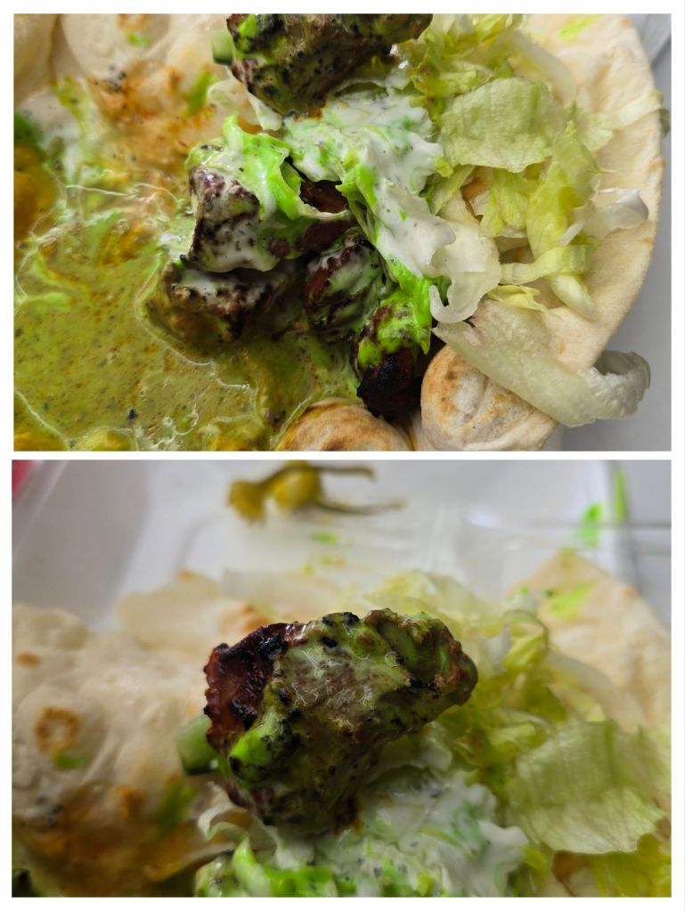 What arrived (after I had added my salad – toms, lettuce, cucumber and pickled chillies – and sauce – garlic and green – selections)